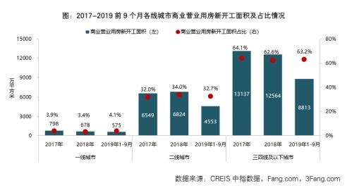 在商業(yè)用房市場,報(bào)告顯示,1~9 月,全國及三四線城市商業(yè)營業(yè)用房開發(fā)投資額、新開工及銷售面積均同比下降;三四線及以下城市商業(yè)營業(yè)用房新開工及銷售規(guī)模持續(xù)領(lǐng)先于一二線城市。
